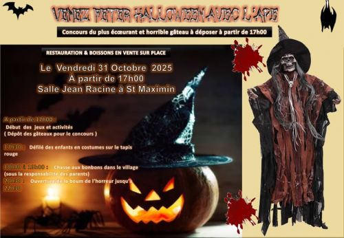 Au programme des activités pour les enfants, défilé en costume, chasse aux bonbons (sous la responsabilité des parents), boum et concours de gâteaux (avec des lots pour les 3 premiers).