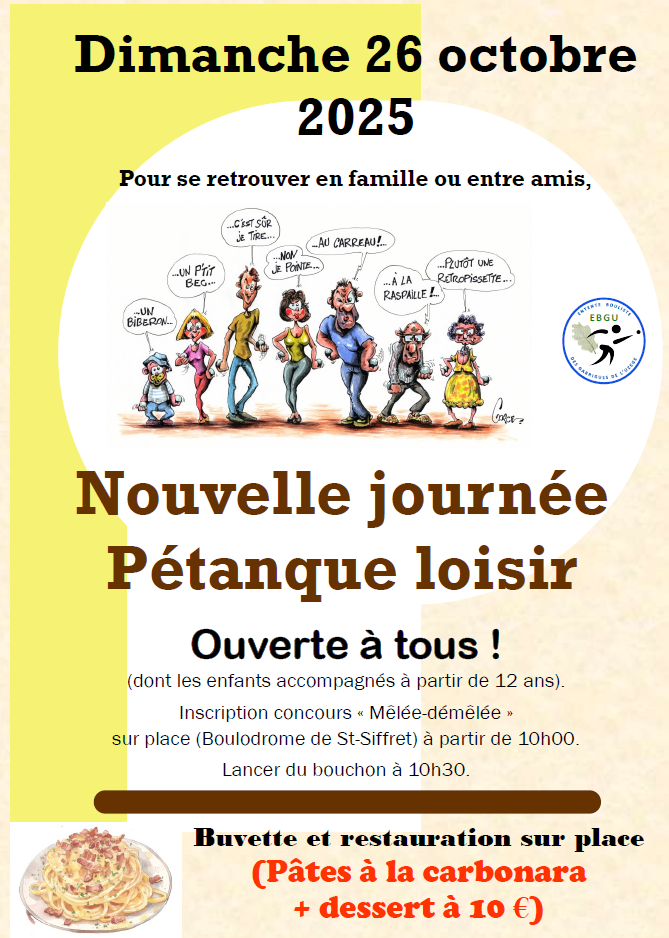 Vous êtes ici : Accueil > Journée pétanque loisir le dimanche 26 octobre 2025 !