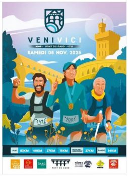 Nous vous informons que ce samedi 8 novembre 2025 se déroulera la 5e édition de la course "Veni Vici", organisée dans le sens suivant : Arènes de Nîmes → Site du Pont du Gard → Place du Duché d'Uzès. L'événement rassemblera environ 10 000 participants répartis sur plusieurs parcours : 82 km, 48 km, 27 km (course et marche nordique), 16 km, et une randonnée de 14 km.