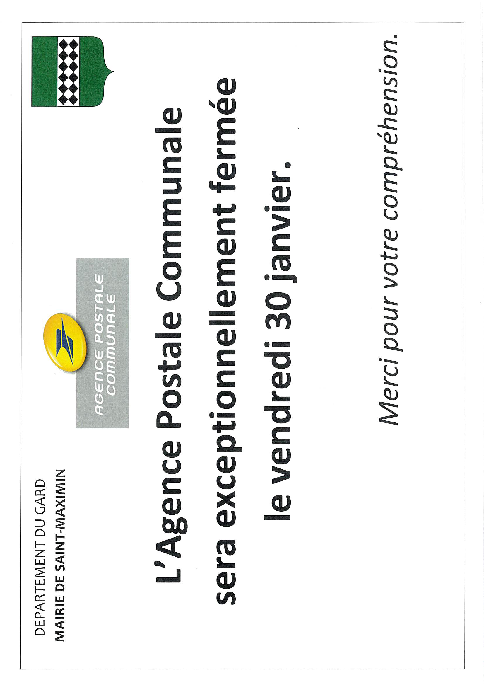 Vous êtes ici : Accueil > Fermeture de l'Agence Postale : vendredi 30 janvier 2026