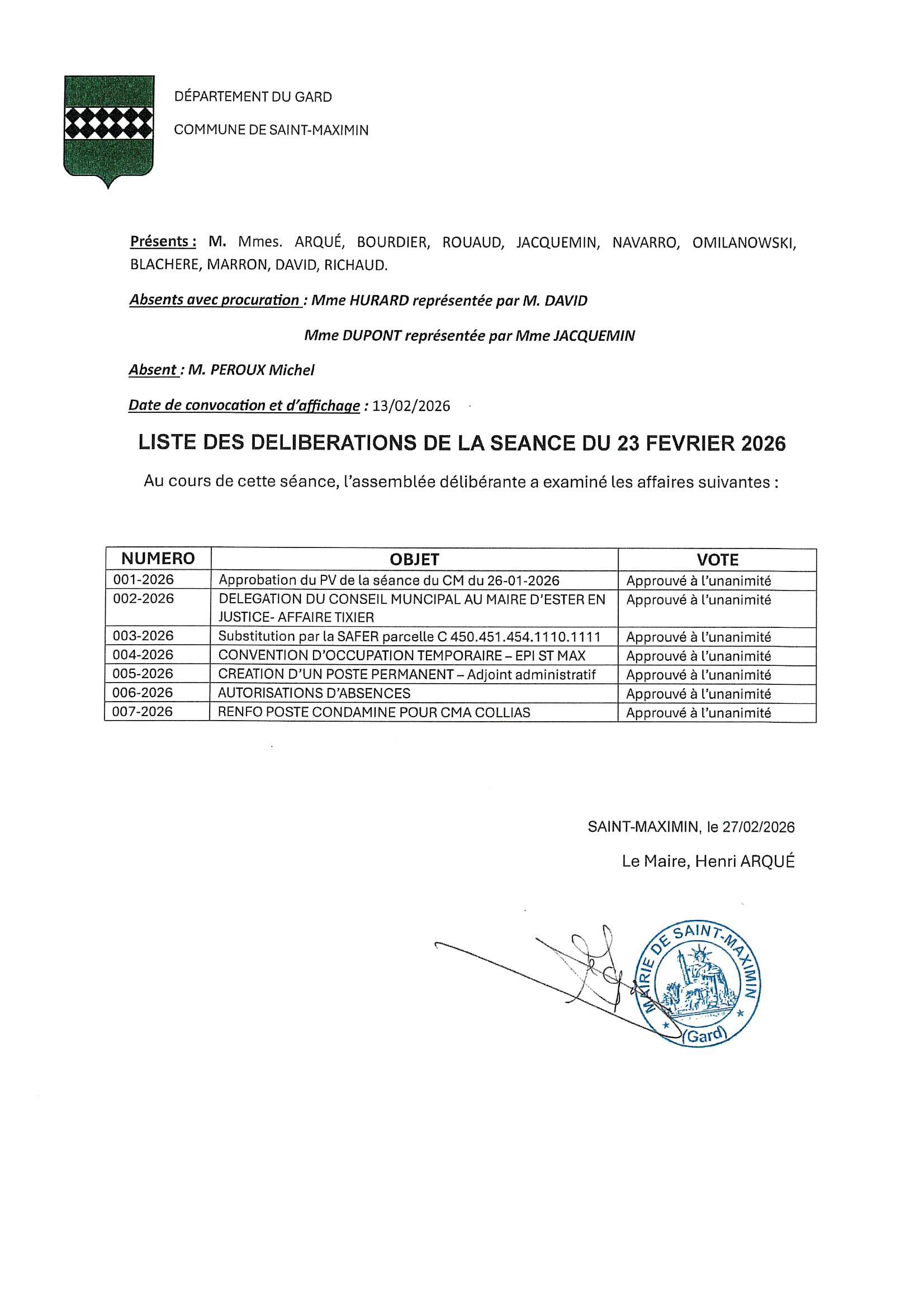 Vous êtes ici : Accueil > Liste des délibérations du Conseil Municipal du 23 février 2026