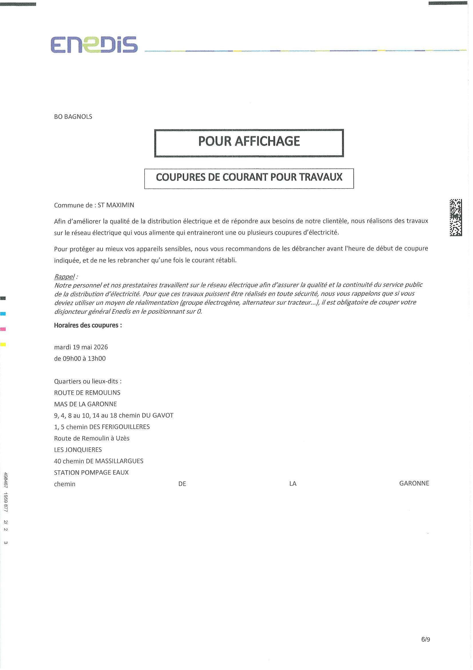 Vous êtes ici : Accueil > Enédis : micro coupures du week-end et coupure du 19 mai 2026