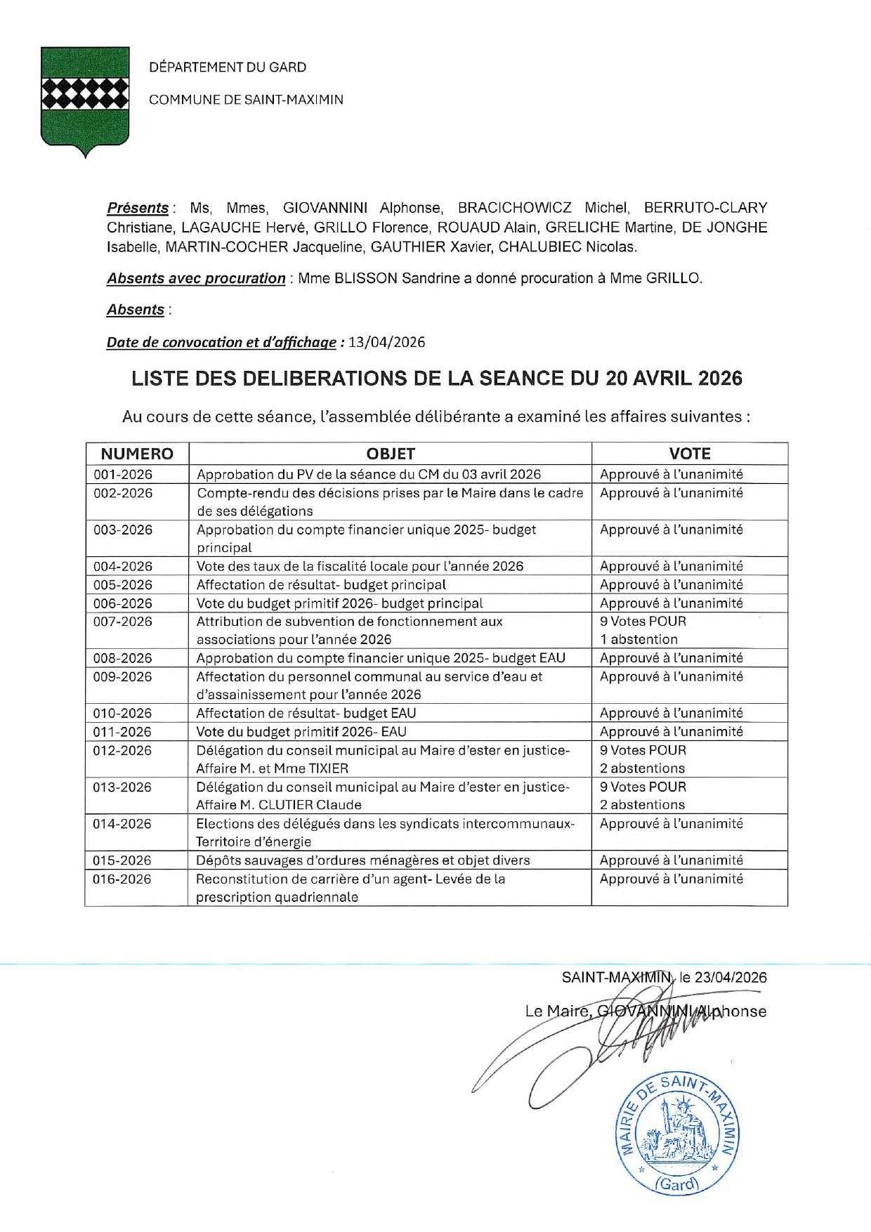 Vous êtes ici : Accueil > Liste des délibérations du Conseil Municipal du 20 avril 2026