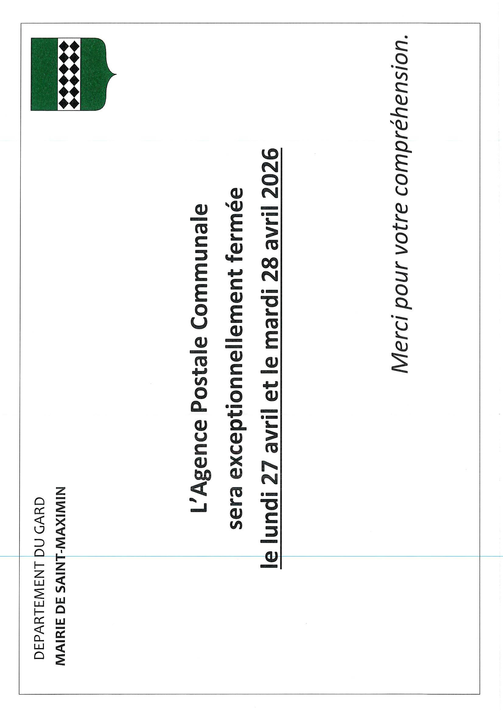 Vous êtes ici : Accueil > Fermeture de l'Agence Postale : lundi 27 avril et mardi 28 avril 2026