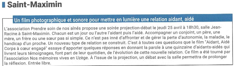L'association Prendre soin de nos aînés propose une soirée projection-débat sur les aidants ce jeudi 25 avril à 18h30 dans la salle Jean Racine, vous retrouverez ci-dessous l'article paru dans le Républicain d'Uzès